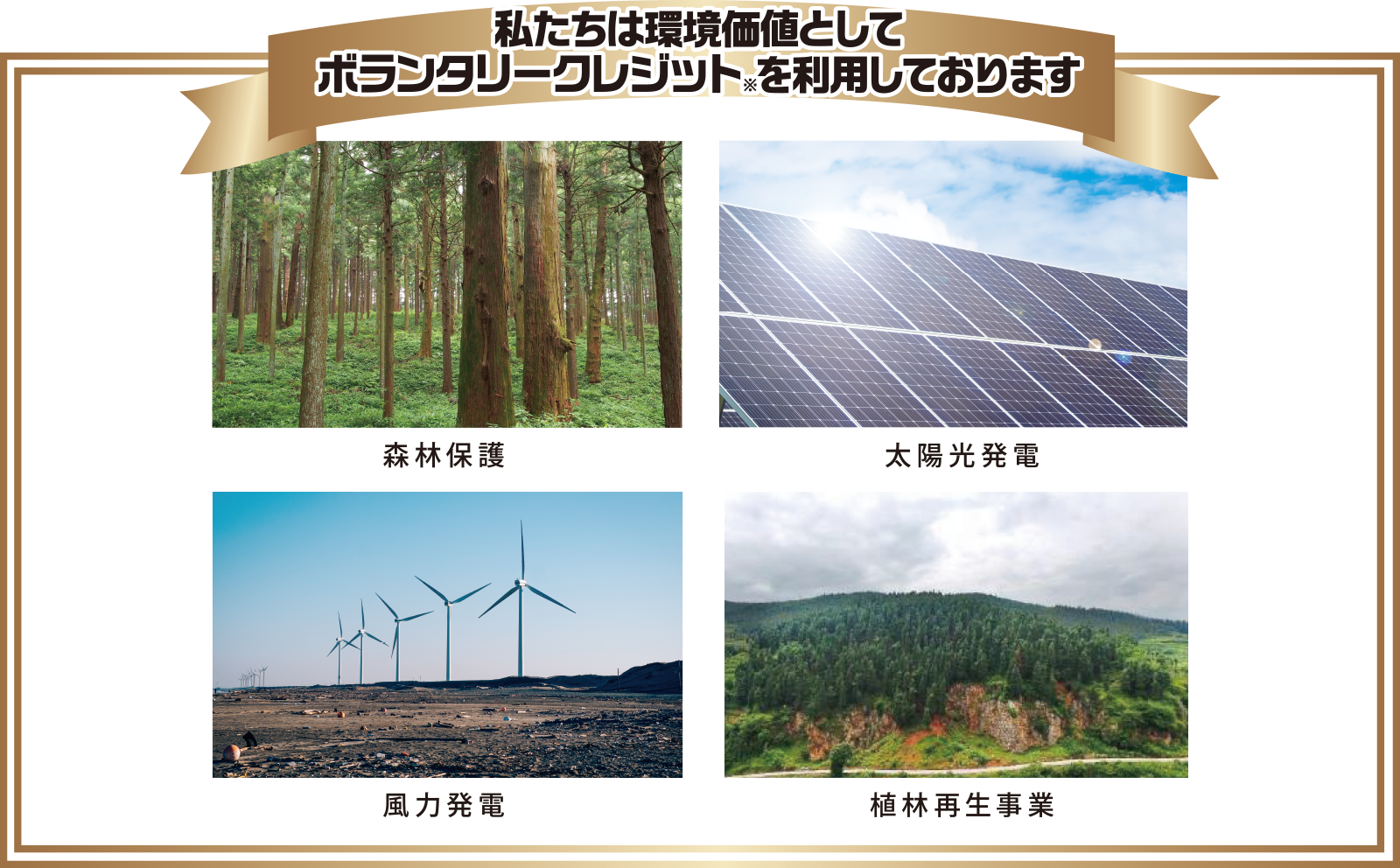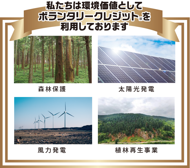 ※ボランタリークレジットとは 国際認証機関が世界各地の温室効果ガス削減プロジェクトにおけるCO₂ 削減効果をCO₂クレジットとして認証したものです。 ※付与されるCO₂クレジッの価格は変動する場合がございます。価格等につきましては担当営業所までお問い合わせください。