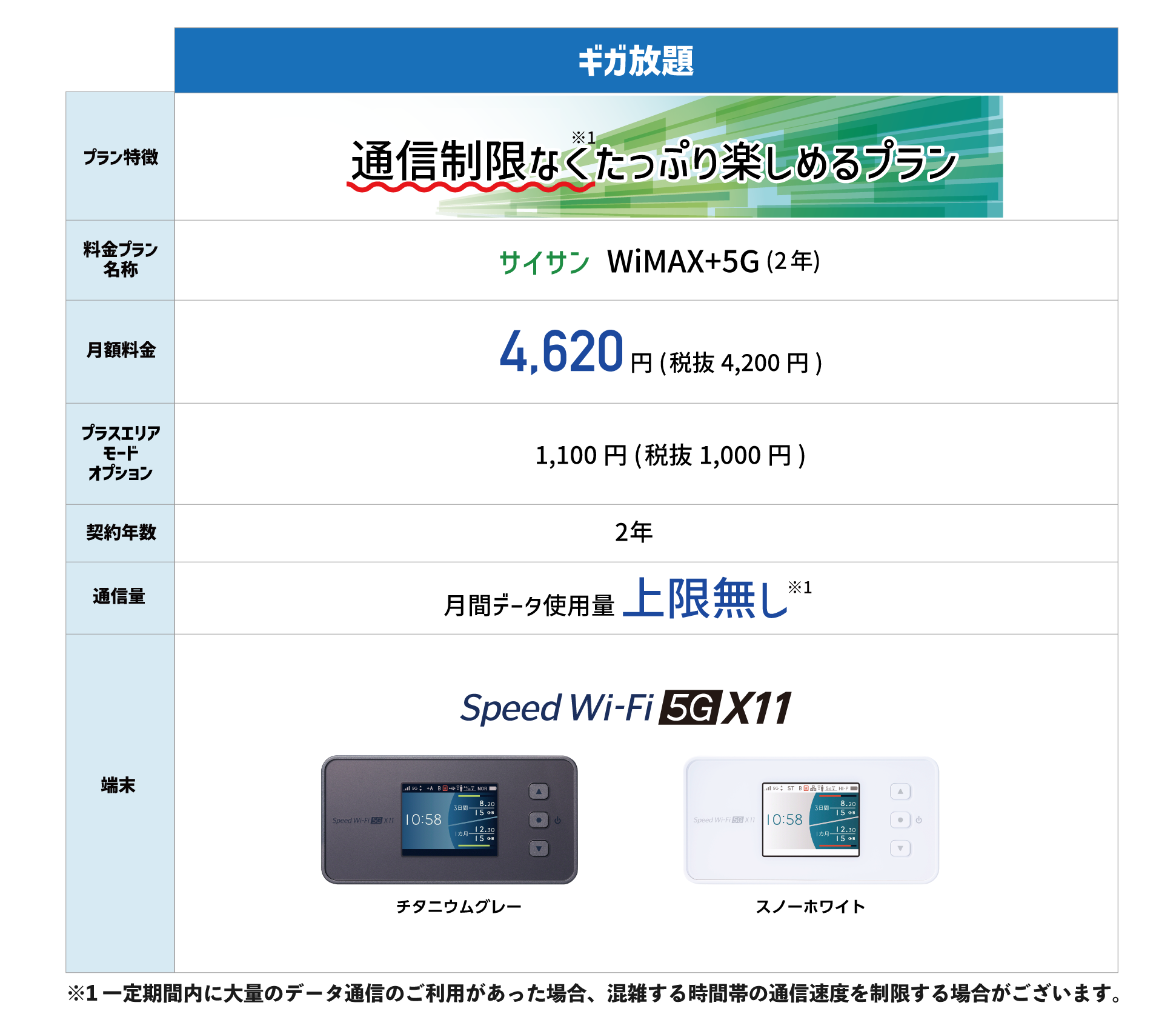 ※1 ネットワークの混雑回避のため、一定期間内に大量のデータ通信のご利用があった場合、混雑する時間帯の通信速度を制限する場合があります。