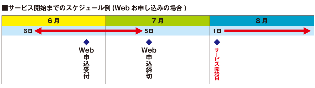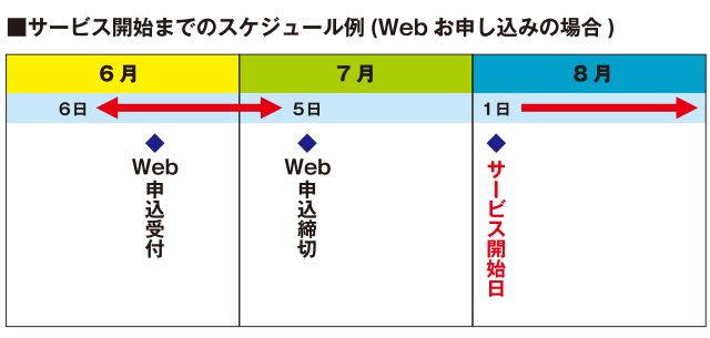 ※毎月5日がWebお申し込みの締日となっております。5日までに受付をさせていただきましたお客さまは、翌月1日よりサービスが開始されます。